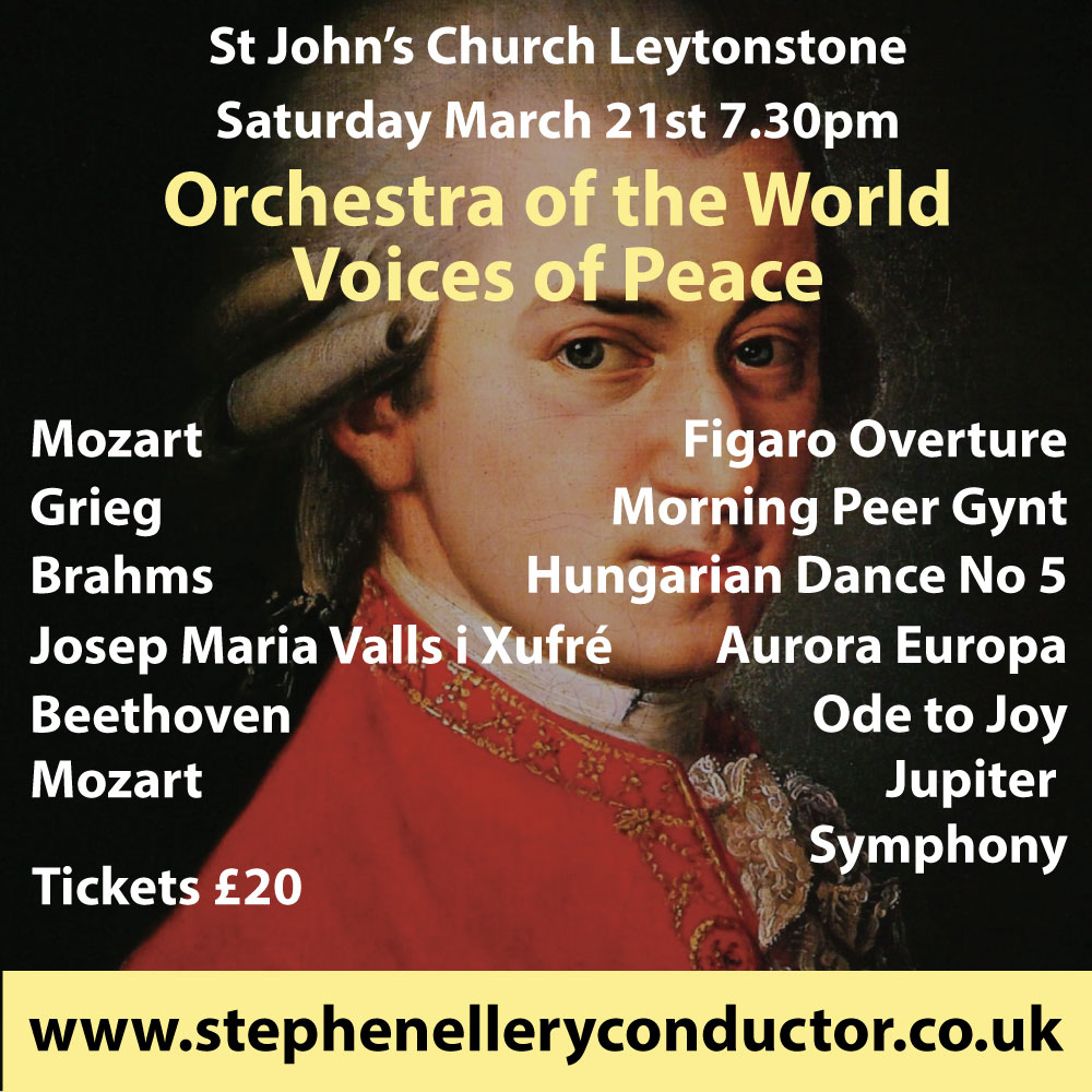 Program also includes Mozart Marriage of Figaro Overture, Grieg "Morning", Brahms Hungarian Dance and UK premier of Aurora Europa by Josep Maria Valls i Xufré with the Voices of the World and solo Pianist Vitas Li and Violinist Archontidi-Tsaldaraki.